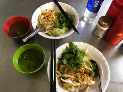 Once our adventure on Sapa came to an end, we were back to Hanoi for one night before heading to Halong Bay! Guess what we did? EAT!!! We didn’t get back until 9pm and there was only one place on my food list that was open late, Pho Hanh. Luckily I watched a youtube video of this place or else we would never have found it because it was down a nondescript narrow alley that lead us to a small kitchen with 2 metal tables filled with patrons gobbling up their dry chicken pho. It was heavenly. The chicken was so juicy and tender, the sauce on the noodles were of a delicious umami flavor. The meal came with a side of refreshing chicken broth. Every bite was heavenly and we just sat quietly savoring it all! This was Jarques’ favorite meal because he requested it again 2 days later and still can’t stop talking about it.